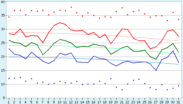 Среднестатические данные по погоде включают дневные максимумы и ночные минимумы температур, количество осадков, солнечных часов и данные по температуре воды.